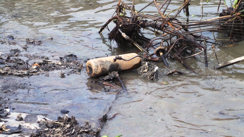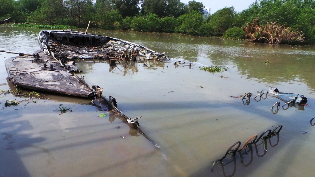 | Một bình chữa cháy mini nằm lăn lóc trên xác tàu cháy. |