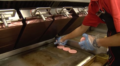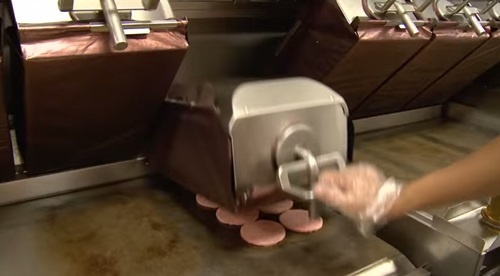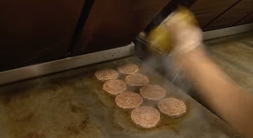 | Quy trình chế biến bánh Cheeseburgers (một loại bánh mỳ kẹp thịt và pho mát) bắt đầu từ khâu đặt từng miếng chả bò lên bàn nướng. |