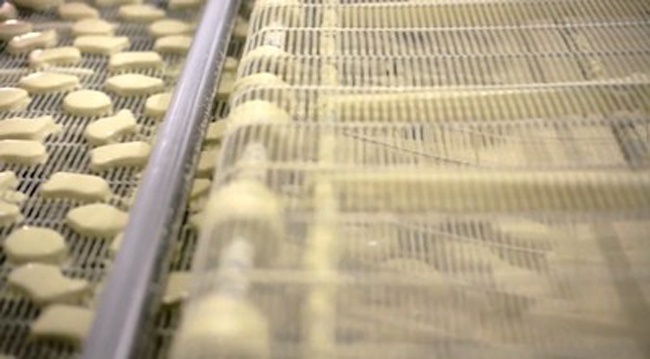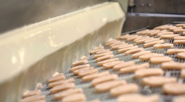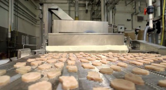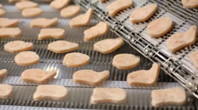 Các miếng gà đi ra từ đầu bên kia trông như những chiếc bánh quy trước khi đưa vào nồi chiên. |