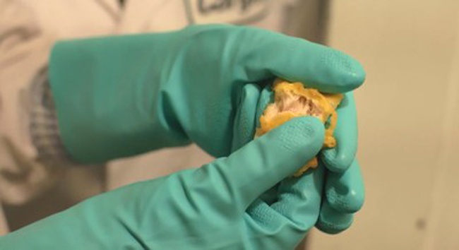 Nếu tách đôi ra, ta sẽ thấy bên trong miếng gà vẫn còn sống. Tiếp theo, các miếng gà sẽ được tiến hành đông lạnh và vận chuyển đến các nhà hàng McDonald's, đây mới là nơi chúng được nấu chín hoàn toàn. |