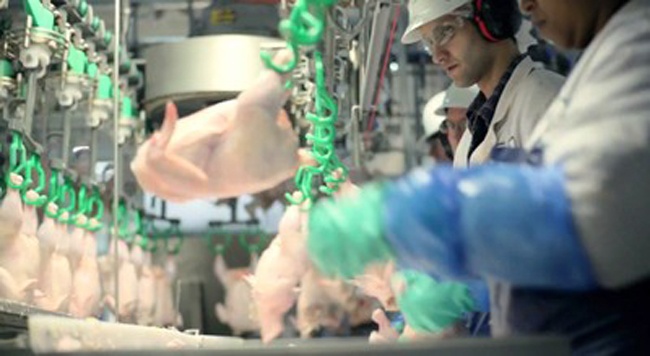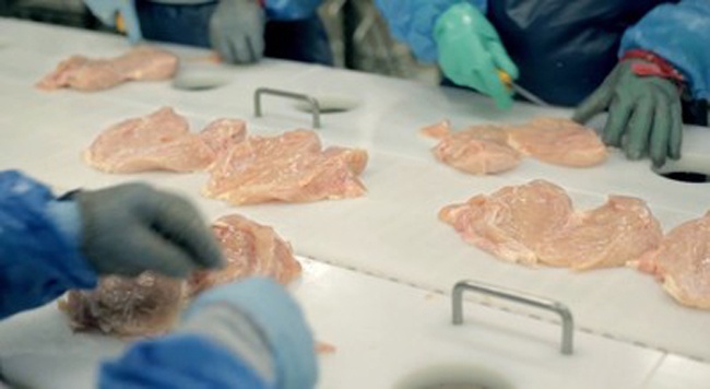 Các công nhân lọc bớt mỡ ở thịt ức rồi đưa vào dây chuyền chế biến. |