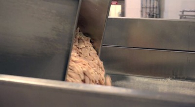 Trong khoang pha trộn, thịt gà được máy đưa lên nhồi vào máy xay. |