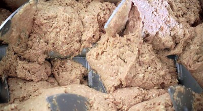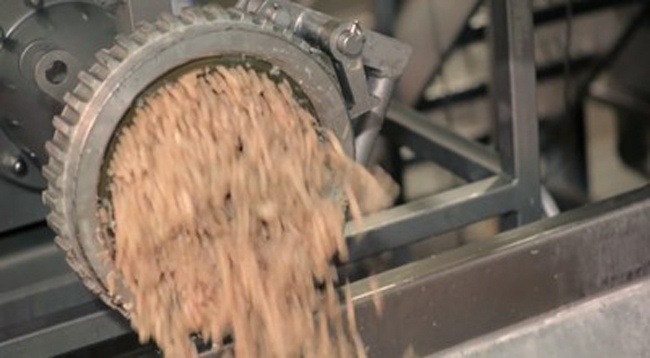 Thịt được nghiền nhuyễn trào ra từ máy xay và được đổ trực tiếp vào máy trộn. |