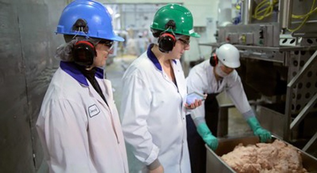 Thịt qua chọn lọc được đưa vào trong thùng rồi vận chuyển đến khoang pha trộn. |
