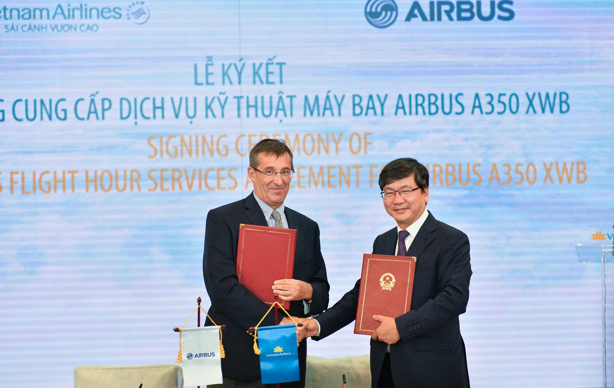 | Chiều 2/7, lễ ký kết hợp đồng cung cấp dịch vụ kỹ thuật máy bay Airbus A350-900 giữa đại diện nhà sản xuất và Vietnam Airlines diễn ra tại nhà khách VIP, ga hàng không T2, sân bay Nội Bài. |