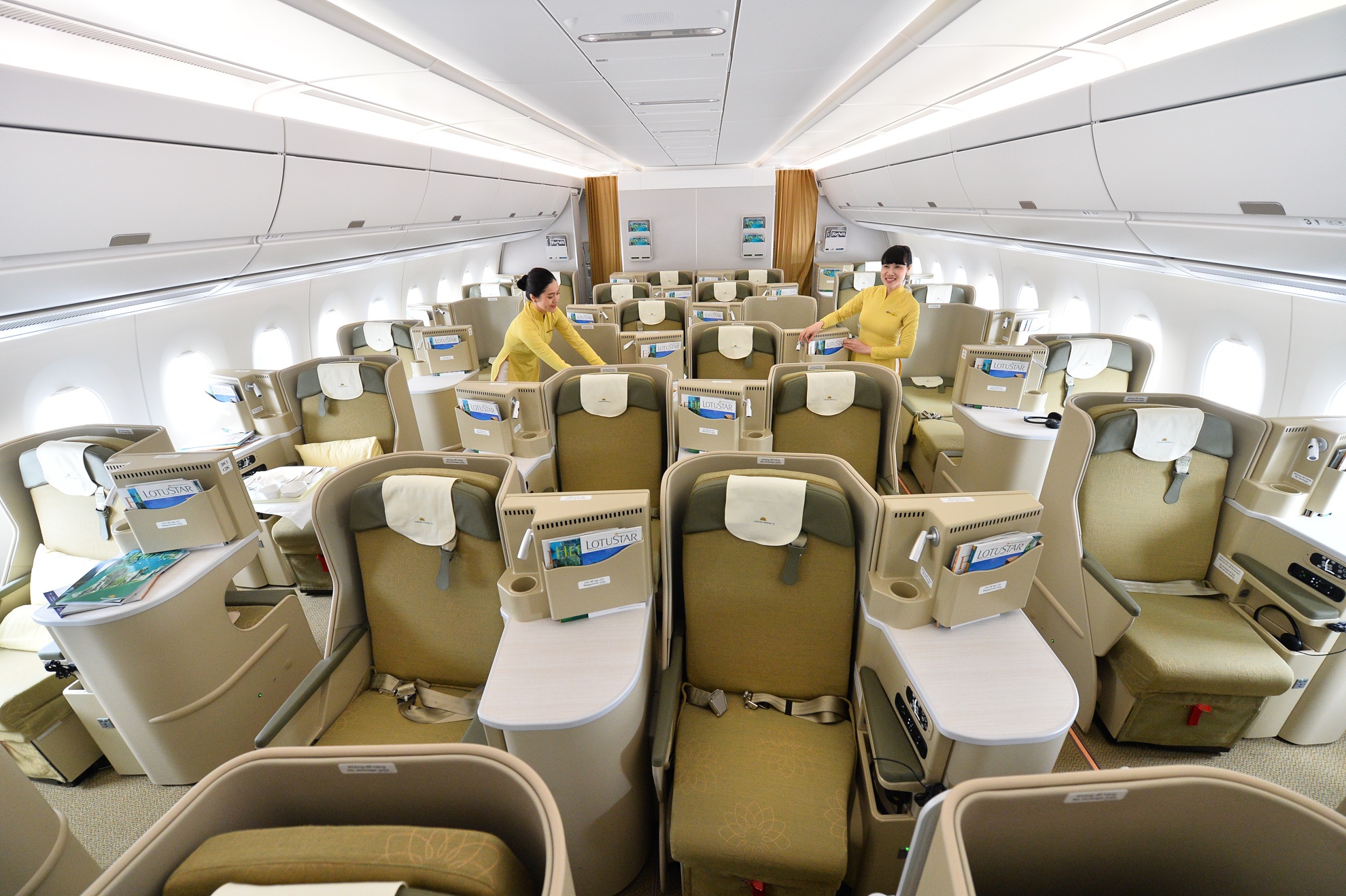 | Đội máy bay thân rộng mới của Vietnam Airlines có hai loại thiết kế chỗ ngồi. Một kiểu gồm 29 ghế hạng thương gia, 45 ghế phổ thông đặc biệt và 231 ghế hạng phổ thông. Một kiểu khác gồm 29 ghế hạng thương gia, 36 ghế hạng phổ thông đặc biệt và 240 ghế phổ thông. Trong ảnh là khoang hạng thương gia. |