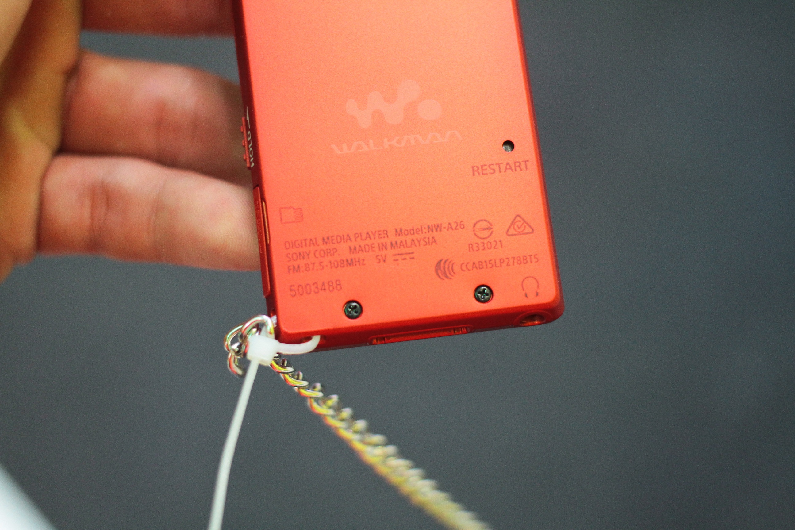 | Thông tin về sản phẩm được in nổi ở nửa dưới, theo đó Walkman NW-A25HN được sản xuất tại Malaysia. |