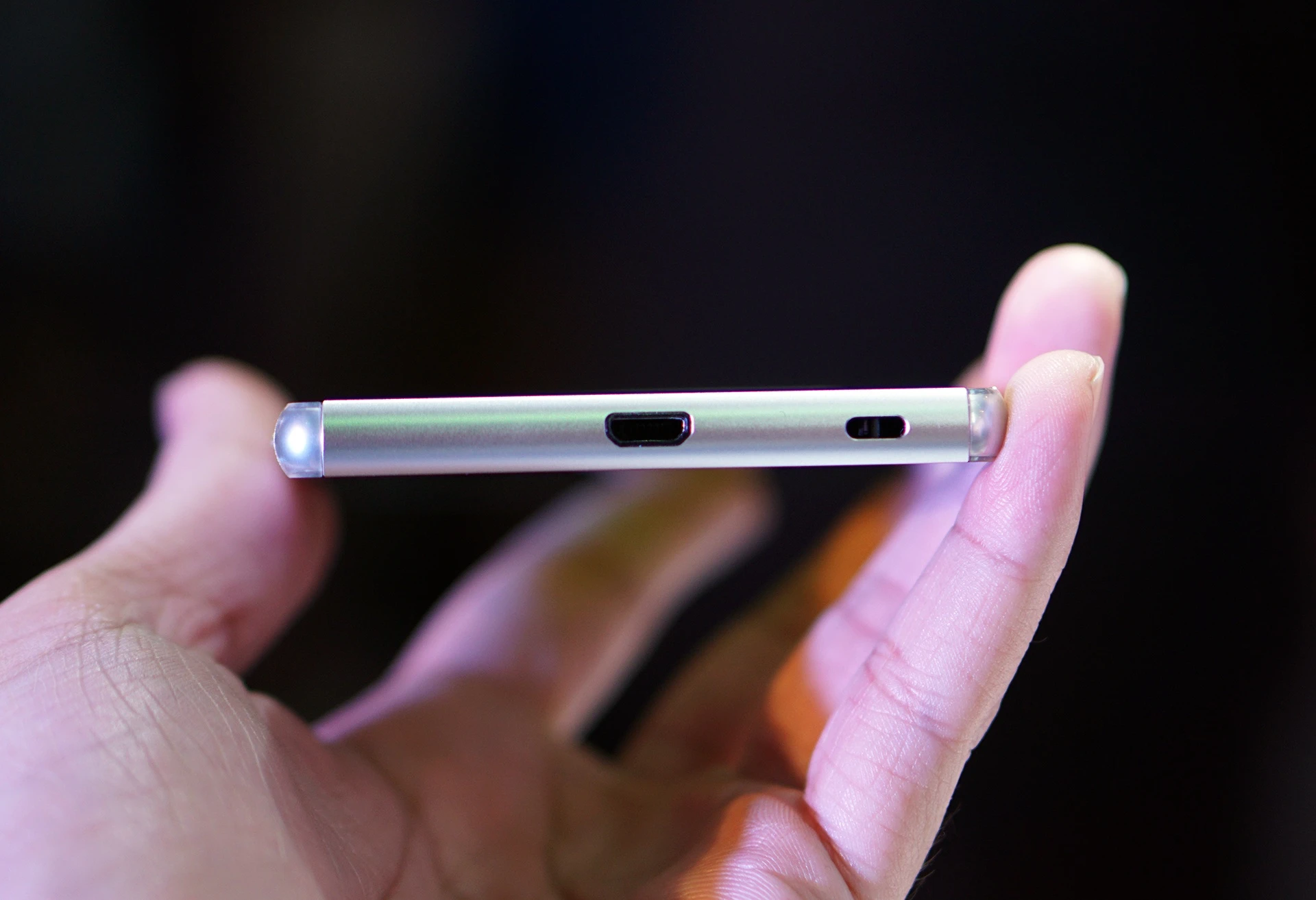 | Cổng microUSB đã được đưa xuống cạnh dưới thay vì cạnh bên như Z3. Cạnh cổng này là khe để đeo dây. |