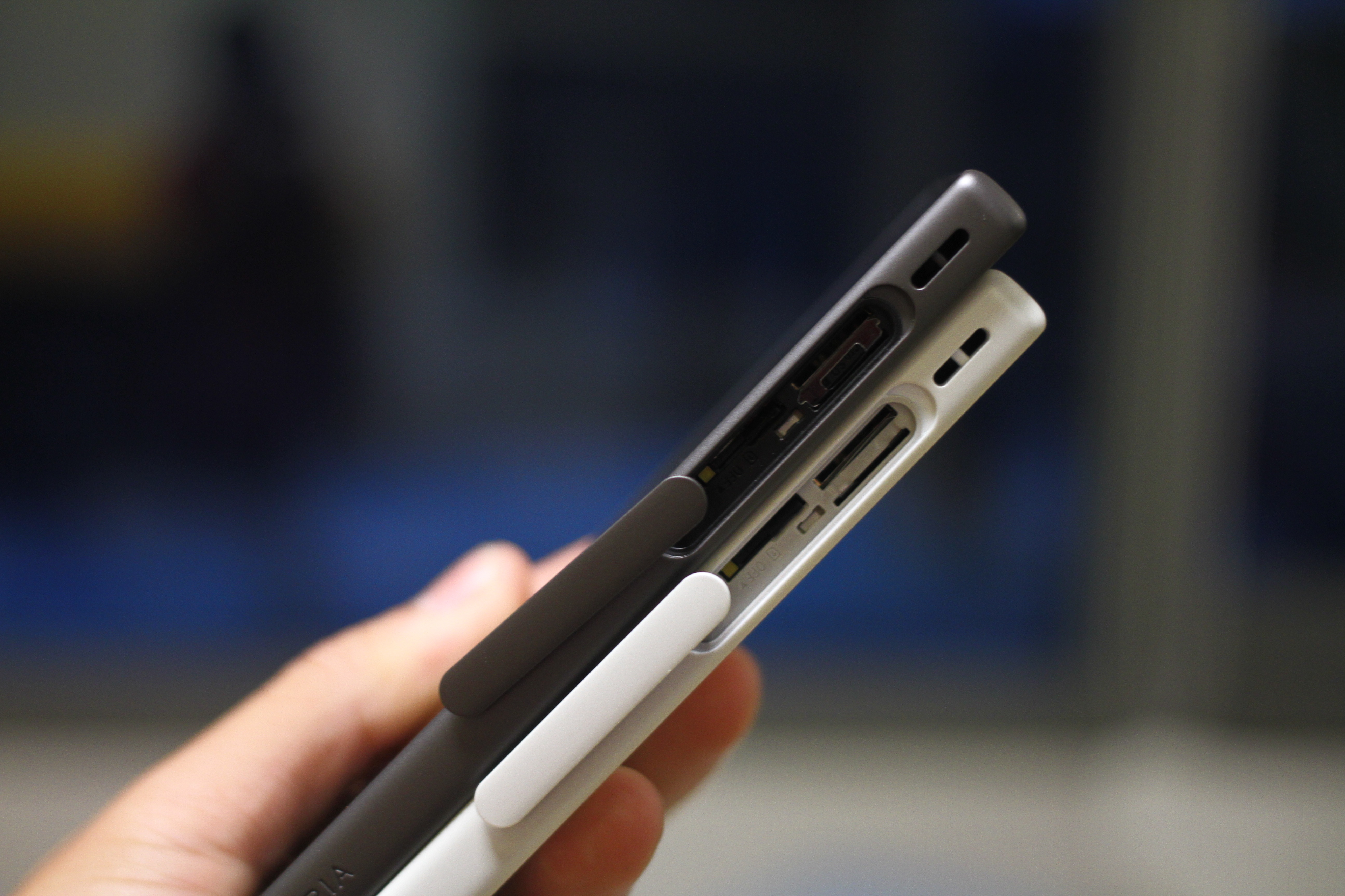 | Khe cắm SIM và thẻ nhớ trên Z5 Compact được thiết kế khá lớn, phía trên là lỗ nhỏ để gắn dây đeo. Máy vẫn được trang bị công nghệ chống nước theo chuẩn IP 68. |