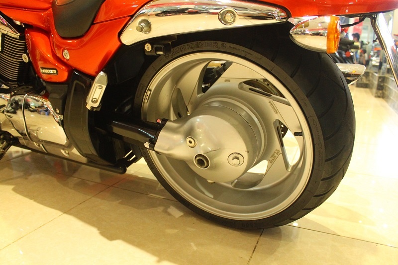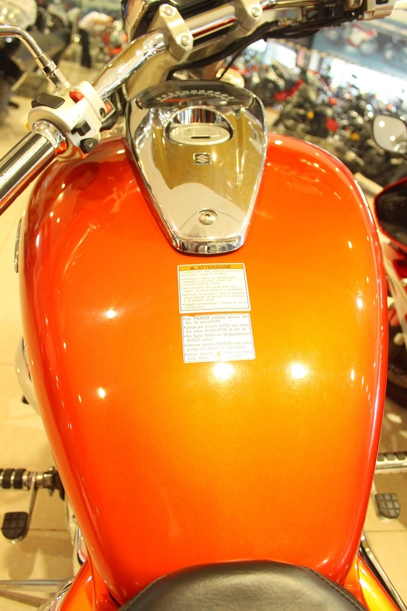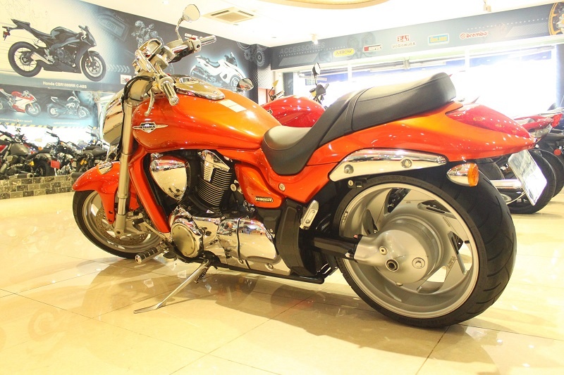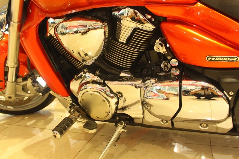 | Cảm giác đầu tiên khi tiếp cận Intruder M1800R2 là một chiếc mô tô khổng lồ. Nó gây choáng ngợp với màu sơn cam, những chi tiết mạ chrome sáng loáng và đường cong như cơ bắp của lực sĩ. |