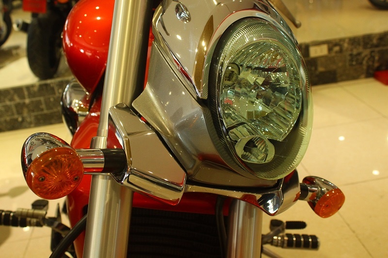 Thay vì đèn pha kiểu “ngoài hành tinh” như trên các phiên bản khác, Intruder M1800R2 sử dụng cụm chóa đèn mạ chrome, nghiêng về phía sau nhằm tăng tính khí động học và thẩm mỹ.