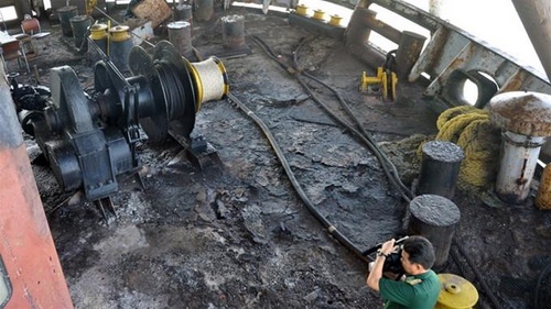 | Phần boong tàu ở mũi tàu (phía trước cabin) đã bị thiêu đen. |