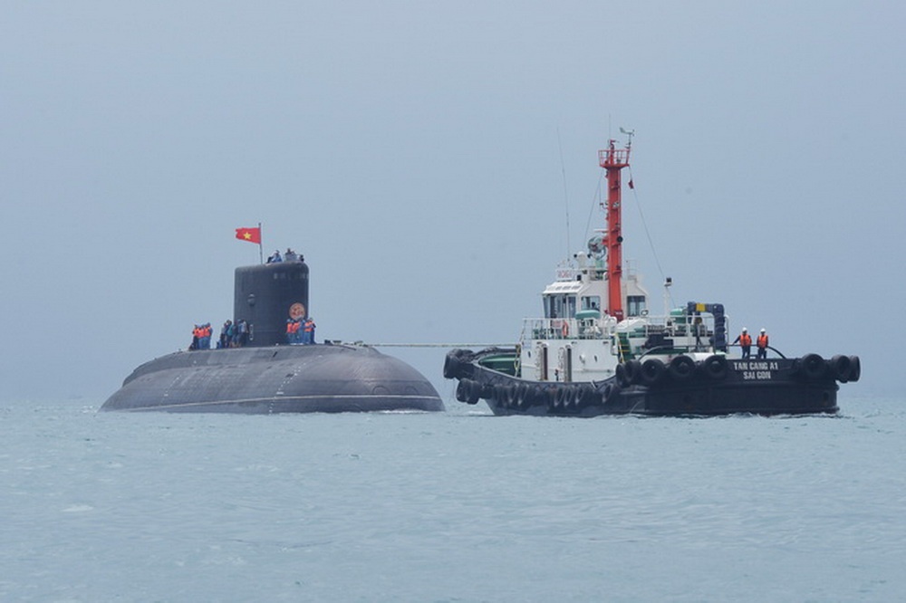 | Tàu của công ty Hoa tiêu Tân cảng (Quân cảng Sài Gòn) đang lai dắt tàu ngầm HQ-183 TP.HCM. |