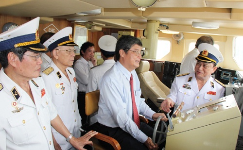 Đô đốc Nguyễn Văn Hiến và Phó bí thư thường trực Thành uỷ TP.HCM Nguyễn Văn Đua (ngồi trên ghế lái) trong buồng lái con tàu.