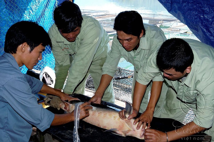 | Cá cái được siêu âm trước khi mổ lấy trứng. |