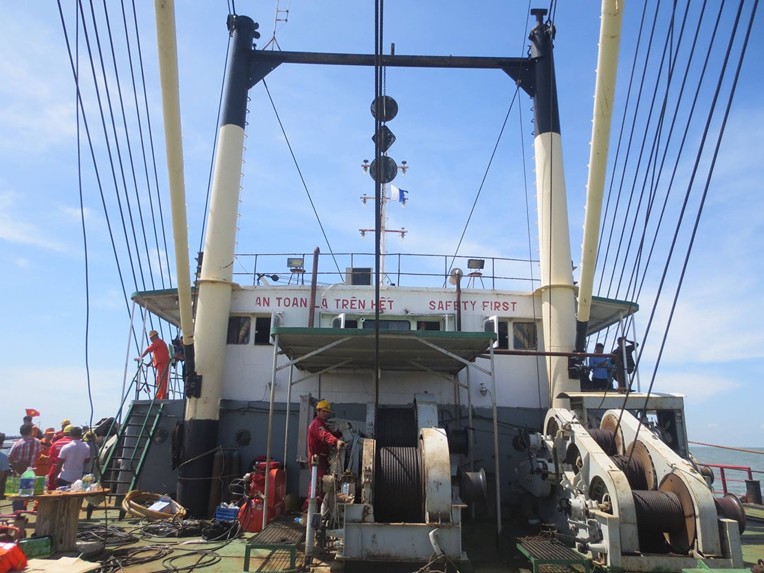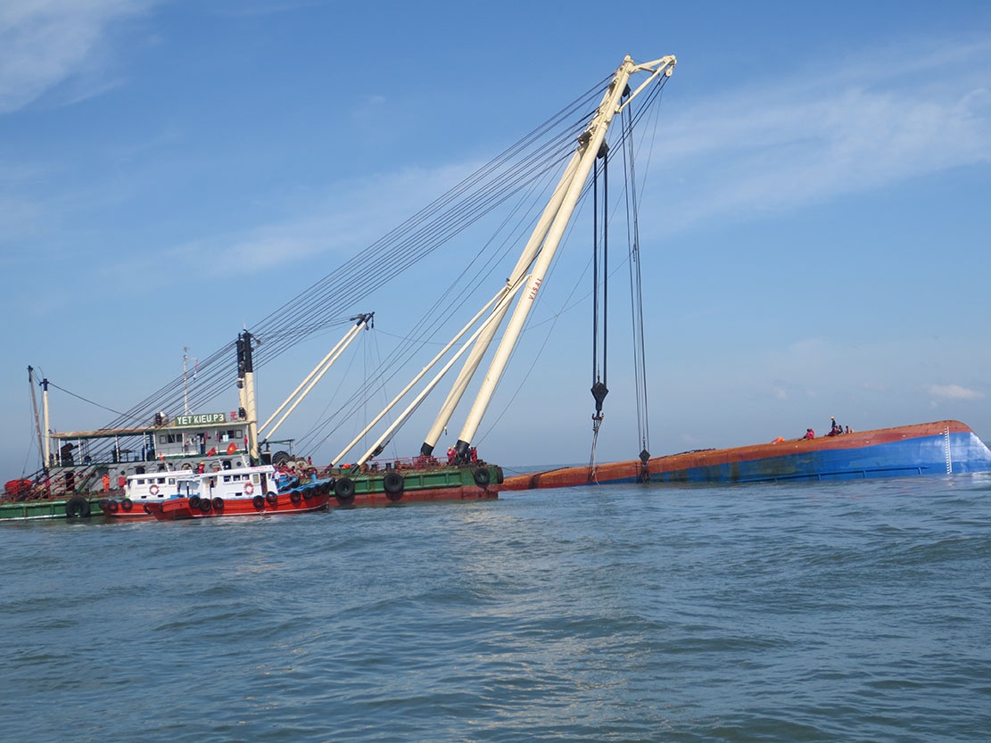 | Sáng cùng ngày, cần cẩu Yết Kiêu 350 tấn của công ty Trục vớt cứu hộ Việt Nam (Visal) đã móc hệ thống cáp, cẩu trục vào mạn tàu. |
