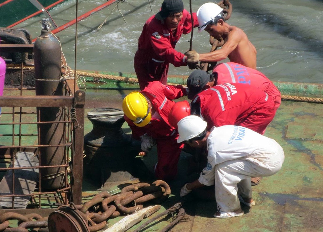 | Lực lượng chức năng cũng cho người nhái lặn vào trong tàu để tìm 2 thuyền viên còn mất tích lần cuối cùng. Sau khi rà soát các khoang, không phát hiện nạn nhân nào thì tàu cần cẩu mới làm nhiệm vụ. |