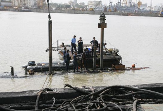 | Bị phá hủy nghiêm trọng sau hàng loạt vụ nổ từ bên trong, tàu ngầm Kilo INS Sindhurakshak của hải quân Ấn Độ gần như chìm hoàn toàn xuống nước. Song song với nỗ lực tiếp cận các thủy thủ còn mắc kẹt, người ta cũng bơm nhiên liệu khỏi thân tàu để giúp nó nổi lên. |