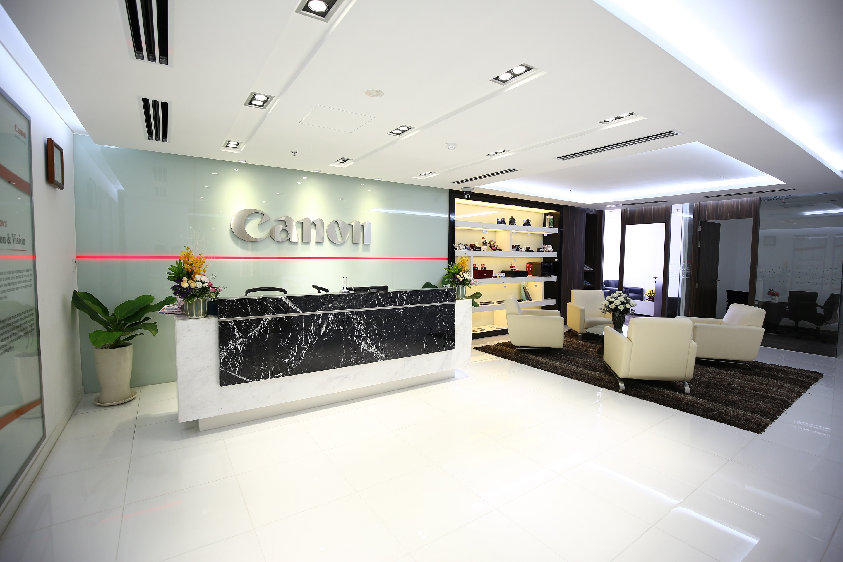Không gian đón tiếp sang trọng, thoáng đãng gây ấn tượng ngay từ lối vào. Với tiêu chí văn phòng xanh, thân thiện, tạo cảm hứng sáng tạo, khu vực làm việc của văn phòng Canon Marketing Việt Nam được lấy ánh sáng tự nhiên từ những cửa sổ lớn.