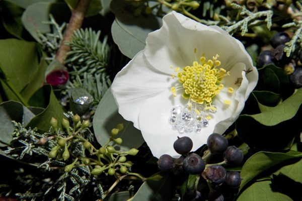 “Tôi đam mê sáng tạo thủ công và việc thiết kế vòng hoa sử dụng những vật liệu tự nhiên và kim cương quả là một trải nghiệm thú vị” - Jokien Carter cho biết. Nhà thiết kế đã chọn những bông hoa đẹp nhất gồm Helleborus bởi vẻ ngoài thanh nhã, phúc bồn tử Hedera cùng các thân dây leo, lá Laurus, Lingonberry và Bulueberry đều có xuất xứ từ Phần Lan. Đá quý được cung cấp bởi 77 Diamonds (thương hiệu chuyên về trang sức cao cấp của Anh quốc).