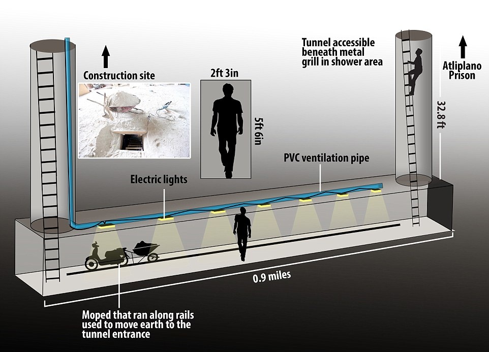 Mô phỏng đường hầm giúp Guzman tẩu thoát. Nó được thiết kế hệ thống thông gió, đèn chiếu sáng, đường ray, xe máy và các thiết bị khác. Đường hầm này đủ cho Guzman, cao gần 1,7 m, di chuyển thoải mái. Ảnh: Daily Mail |