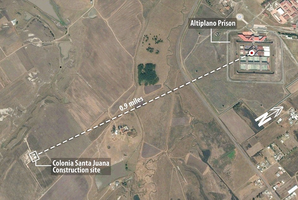 Vị trí đường hầm trên ảnh vệ tinh. Nó dẫn thẳng từ nhà tù an ninh nghiêm ngặt Altiplano (bên phải) sang ngôi nhà xây dở nằm cách đó 1,5 km. Ảnh: Daily Mail |