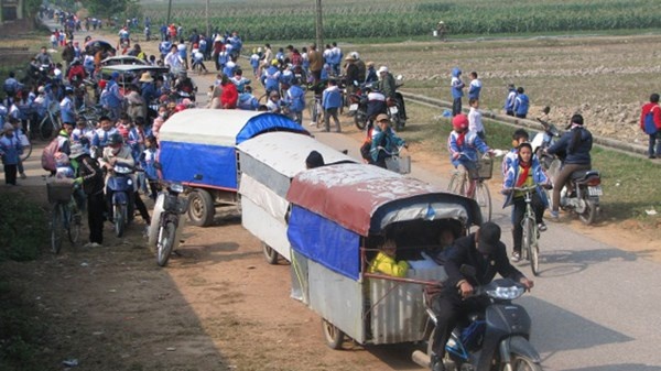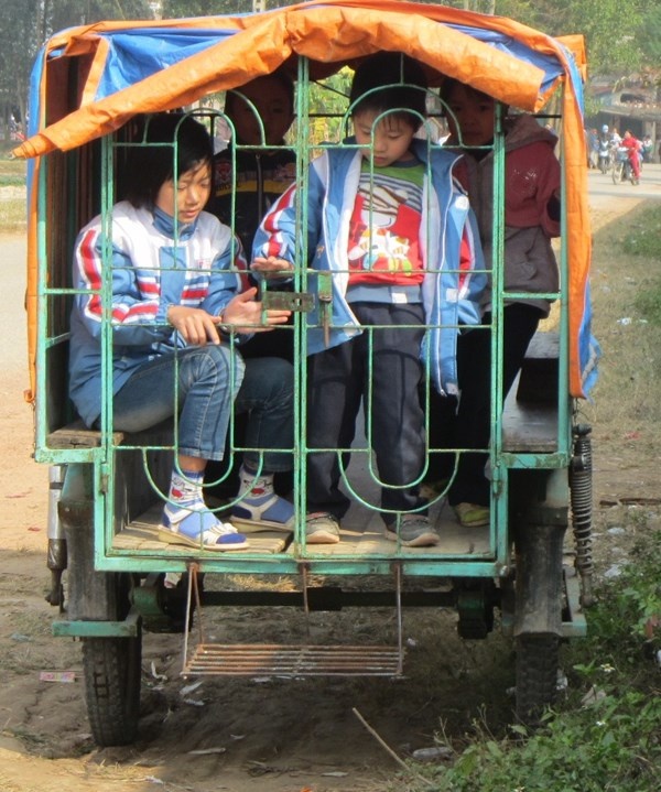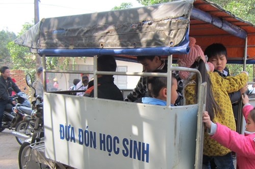 Chỉ trên địa bàn xã Hiền Ninh (huyện Sóc Sơn, Hà Nội) có khoảng 12 chiếc xe tự chế, thường xuyên đưa đón học sinh. Mỗi xe chở gần 30 em, chen chúc ngồi trong chiếc thùng lợp kín, duy nhất một cửa ra vào. |