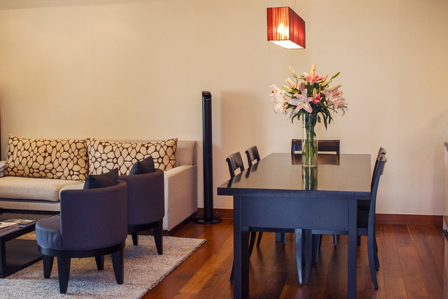 Bàn ăn được đặt cạnh ghế salon là nơi cô và người thân thưởng thức các bữa ăn do chính cô trổ tài nấu nướng, một trong những sở thích của người đẹp khi rảnh.