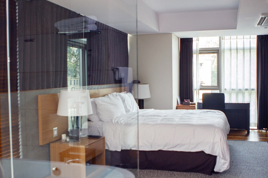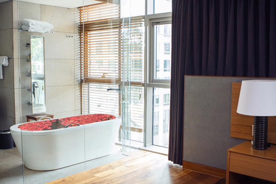 Phòng tắm liên thông với phòng ngủ bằng một bằng chiếc kính trong suốt. Không gian phòng tắm thông thoáng với những ô cửa sổ rộng, có rèm che khi cần thiết.