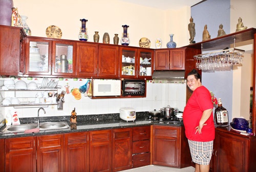 | Căn bếp thoáng đãng, sạch sẽ của gia đình Hoàng Mập. |