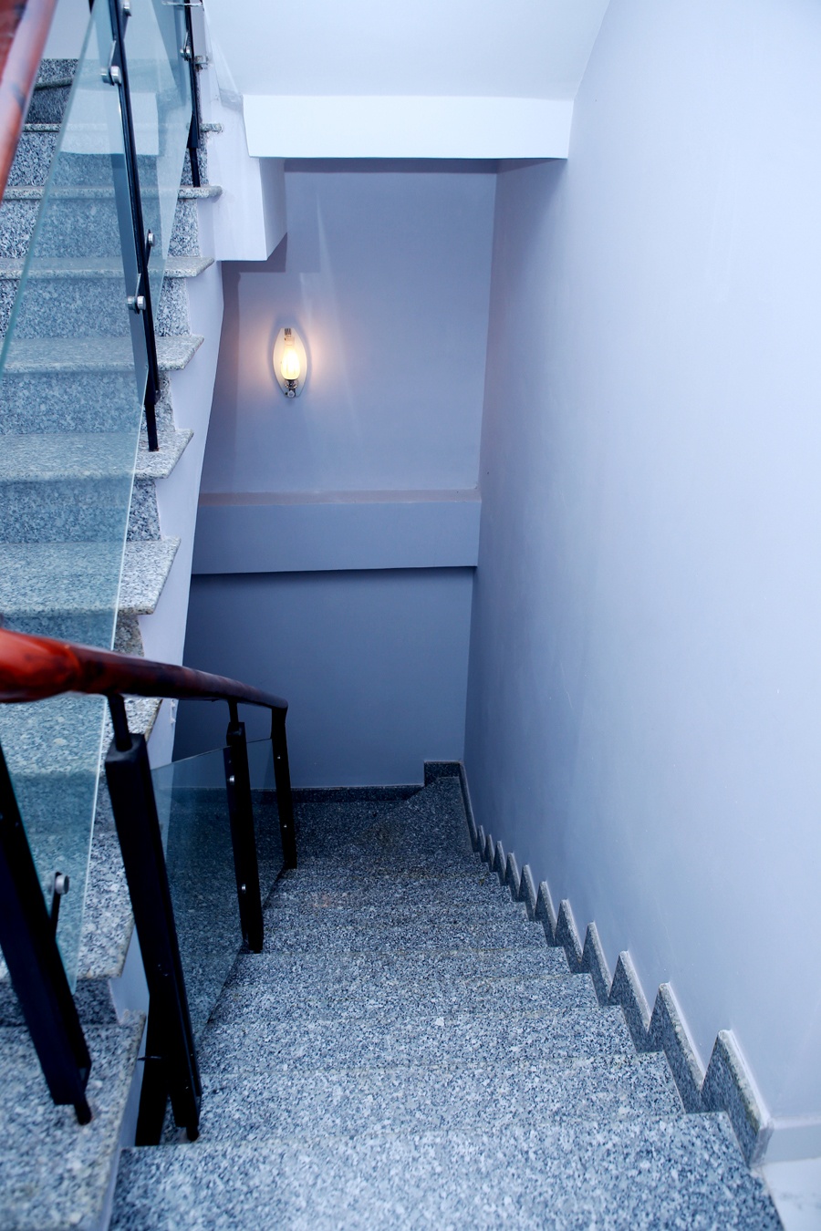 Toàn bộ các cầu thang đều được lát đá. Tay vịn cầu thang được trang trí đơn giản nhằm tạo ra những khoảng không thông thoáng cho căn nhà.