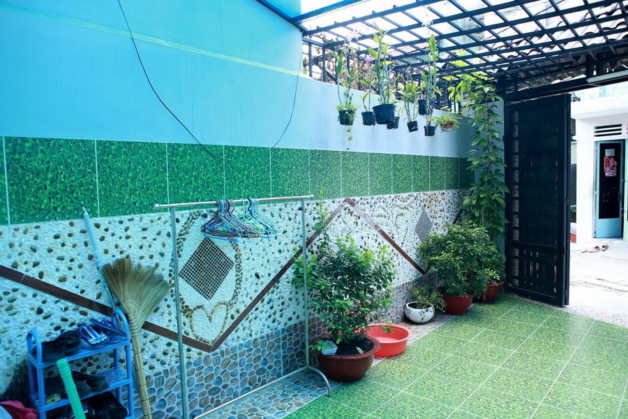 Ở tầng trệt, anh để dành một khoảng sân rộng để đậu xe và trồng một vài cây xanh nhỏ tạo không gian thoáng đãng cho căn nhà.