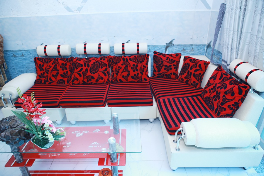 Bộ ghế sa-lon có tông màu đỏ phù hợp với mạng hỏa của nam chủ nhân là điểm nhấn của căn phòng.