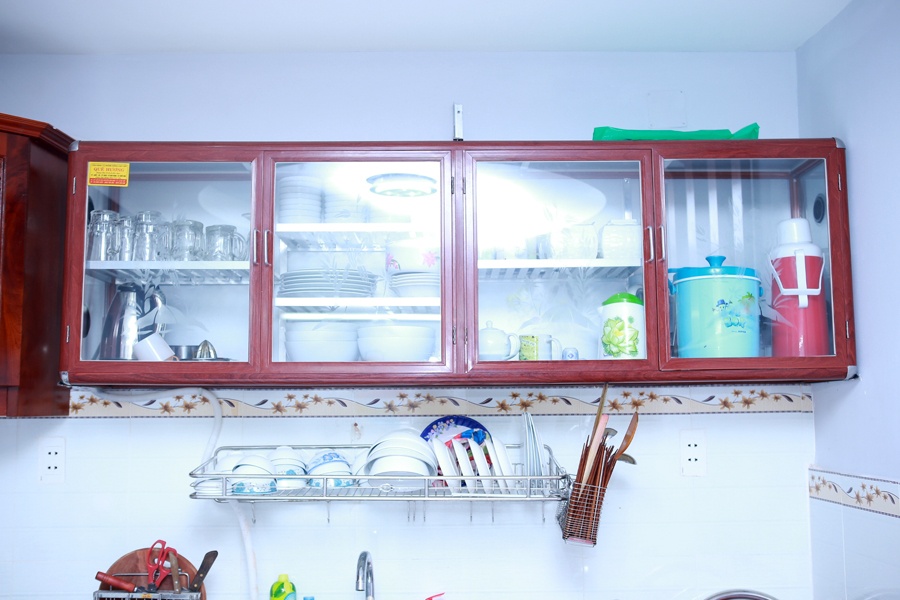 Phòng bếp gọn gàng và ấm cúng. Tuy nhiên, điều khiến Hồ Quang Hiếu tiếc nhất là không có nhiều thời gian dùng cơm cùng gia đình vì thường xuyên phải đi lưu diễn xa nhà.