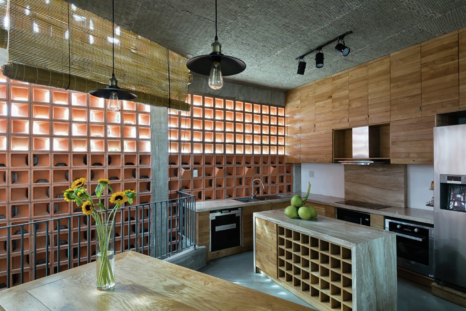 Ở mặt tiền, kiến trúc sư sử dụng giải pháp hai lớp áo, với lớp vỏ ngoài là gạch bông gió làm từ đất nung, được gia chế thêm một góc vát. Cách bố trí gạch theo nhiều chiều ngẫu hứng tạo nên tính nhịp điệu độc đáo cho mặt đứng công trình và các hiệu ứng về thị giác cho không gian bên trong khi nắng qua nhà.