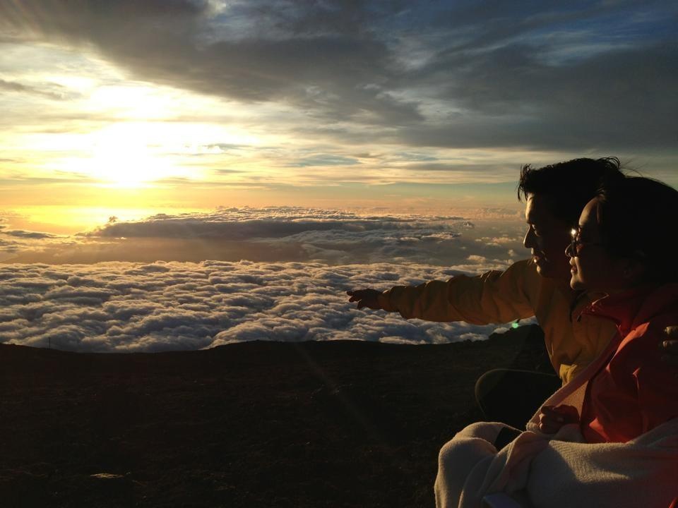 Cặp đôi hạnh phúc ghi lại khoảnh khắc tình yêu giữa bầu trời của hai người. |