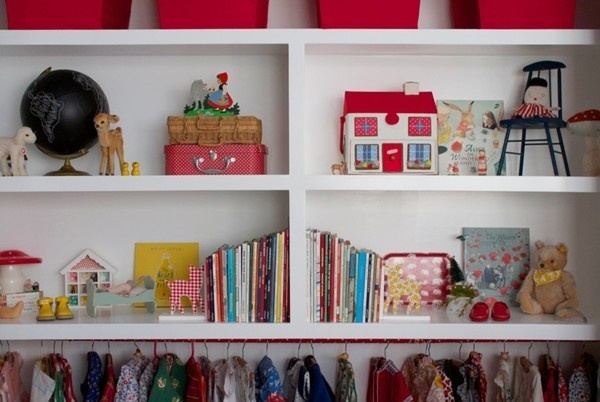 Cha mẹ của bé Maja đã sử dụng những thiết kế tủ, kệ đa năng âm tường và khéo léo tận dụng những khoảng không gian thấp để giúp bé dễ dàng tiếp cận cũng như thu dọn đồ chơi sau khi chơi. Hệ kệ âm tường khá lớn này là nơi lưu trữ sách vở, đồ chơi và quần áo rộng rãi của cô bé.