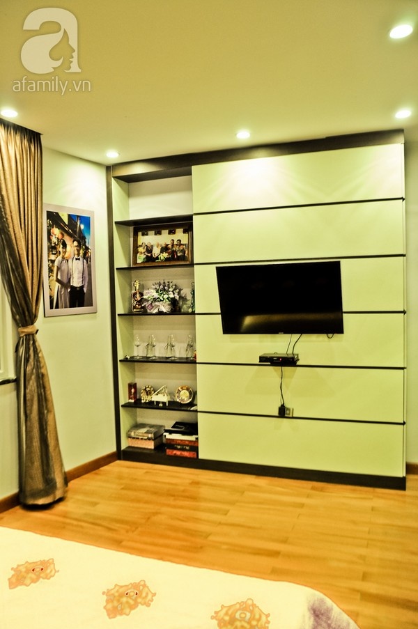 | Phần vách ốp tivi có thể mở được để tận dụng làm khoang để đồ. |