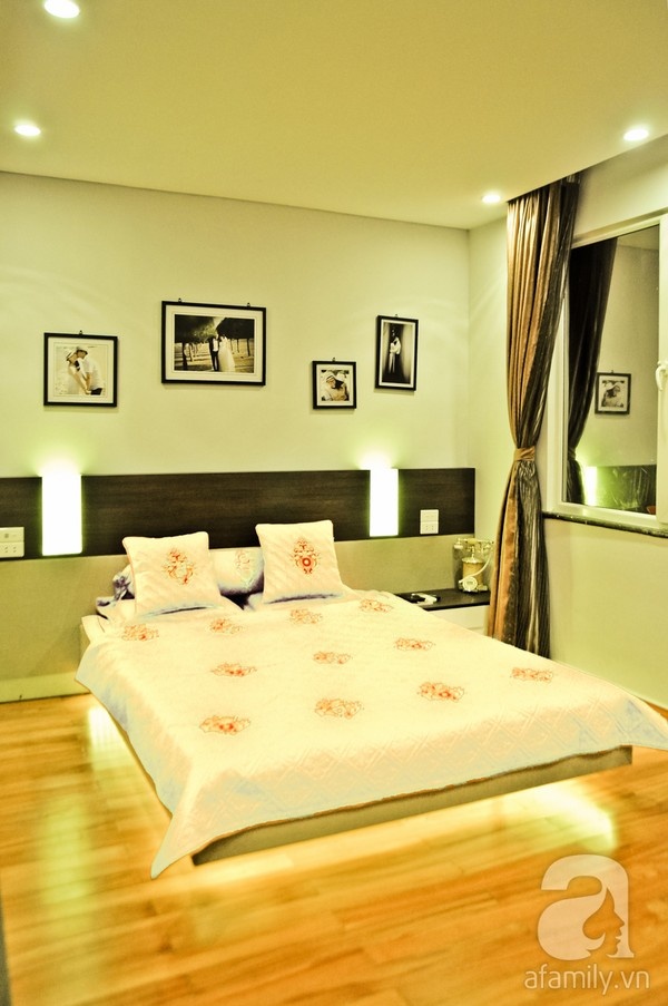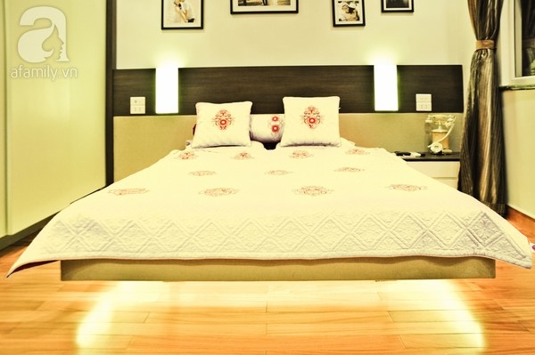 Giường ngủ được bố trí vào vị trí bàn làm việc trước đây, hốc tường cũ đã được bịt vào tạo thành mảng phẳng. Chiếc giường dạng flying bed có thiết kế độc đáo, cảm giác như không thấy chân giường, giúp việc lau dọn thuận tiện hơn và tạo không gian như rộng hơn.