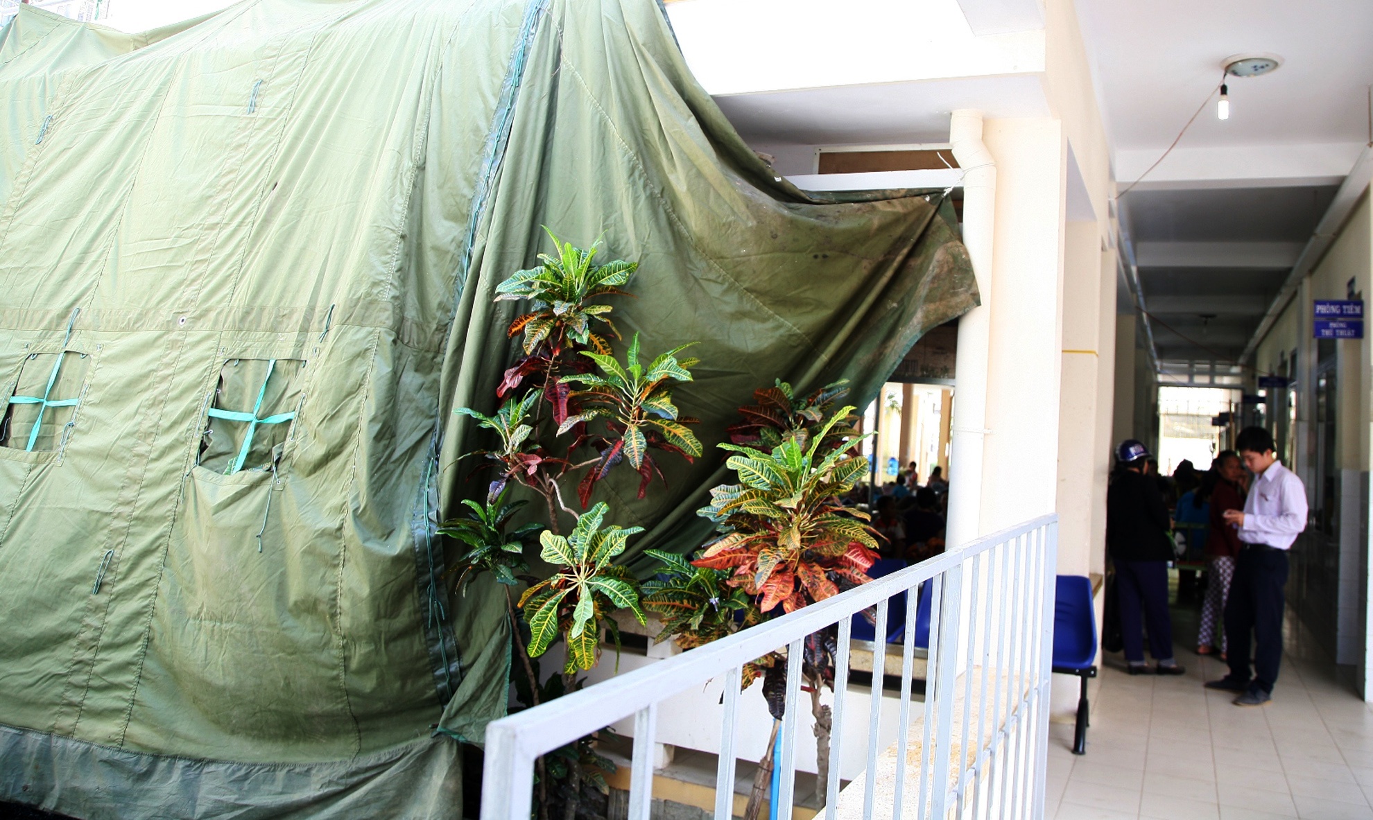 Lãnh đạo bệnh viện dựng lên nhiều tấm bạt lớn che mưa gió cho bệnh nhân nằm ngoài hành lang.
