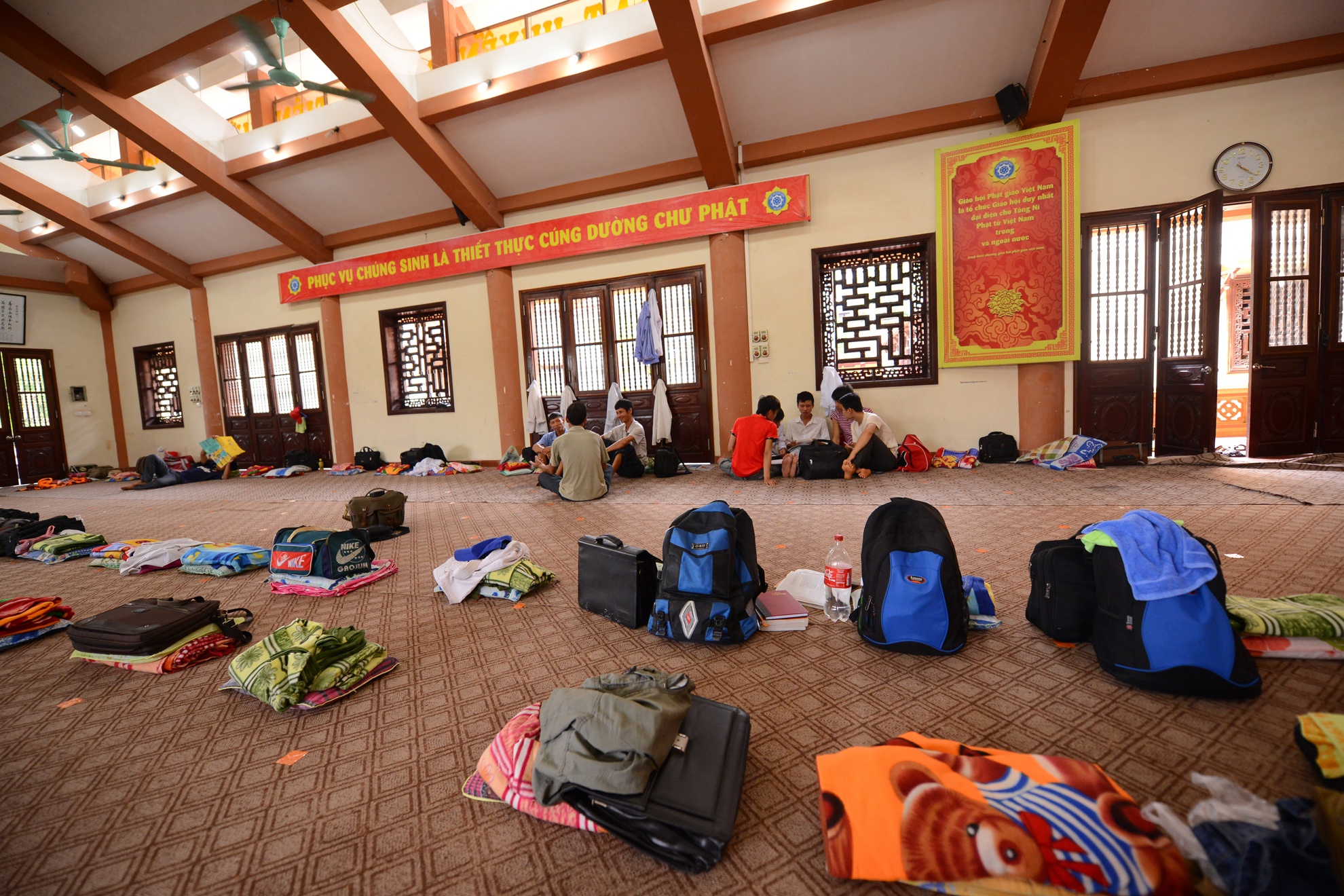 Hai căn phòng họp rộng 100 m2 được nhà chùa tận dụng làm phòng ở trong thời gian 4 ngày của đợt 1. Chăn chiếu, gối, quạt... có đầy đủ nhằm tạo điều kiện tối đa cho các thí sinh.