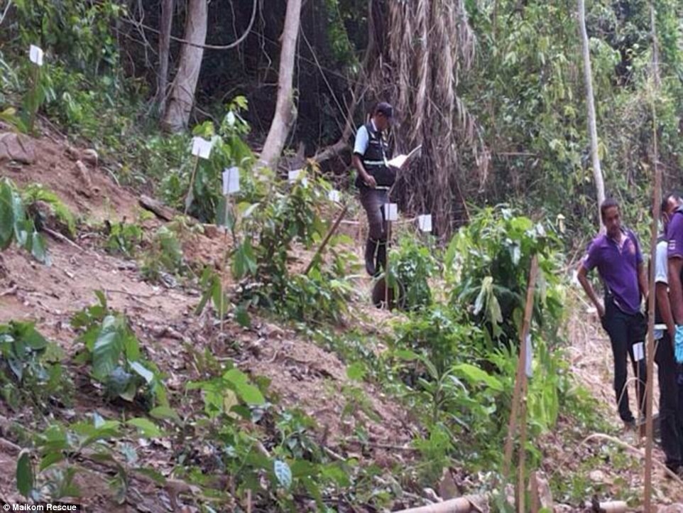 | Hơn 200 cảnh sát và nhân viên cứu hộ đi bộ gần một giờ để tiếp cận khu trại của bon buôn người. Nhà chức trách đã phong tỏa khu vực xung quanh để khai quật mộ và thu thập chứng cứ. |
