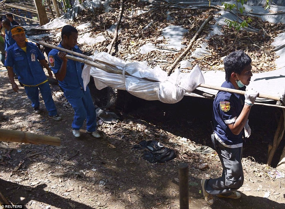Cảnh sát khai quật hàng chục thi thể đang phân hủy trong một khu vực hẻo lánh ở miền nam Thái Lan. Các nạn nhân là người tị nạn từ Myanmar và Bangladesh.