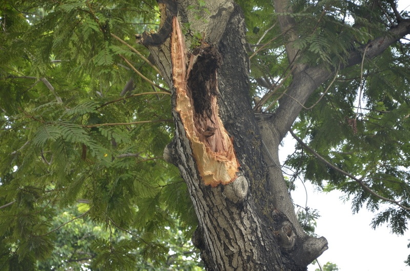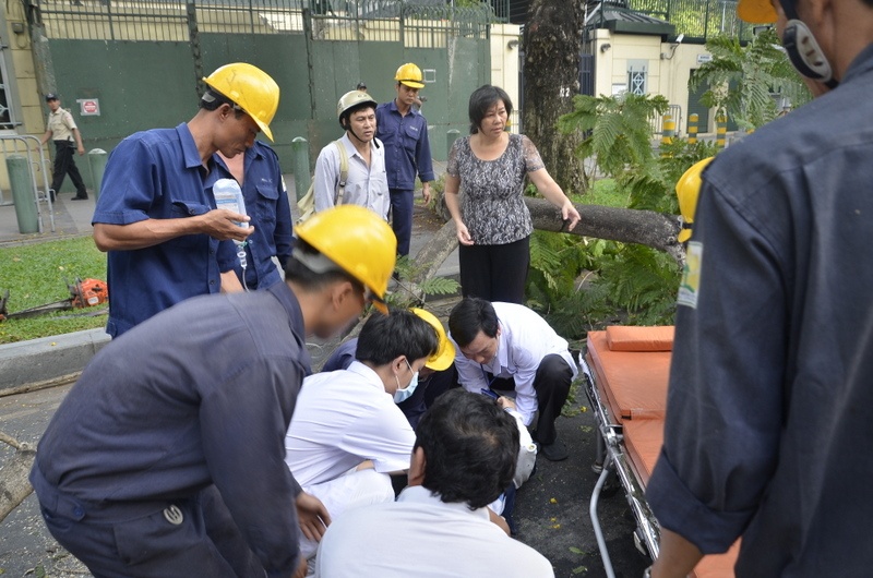 Đang lưu thông trên đường Lê Duẩn, quận 1, hai người đi hai xe máy bất ngờ bị cành cây to gãy rớt trúng đầu, một người gãy chân, một người đa chấn thương.