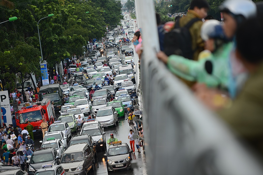 | Bên ngoài hai tuyến phố Liễu Giai và Đào Tấn tắc nghẽn. Trên cầu vượt nhiều người hiếu kỳ tụ tập đứng xem khiến khu vực này lộn xộn như chợ vỡ. |