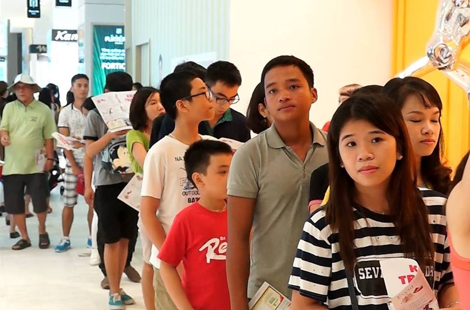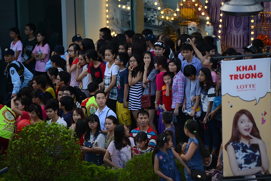 | Khách đến đây chủ yếu là gia đình trẻ, thanh niên và trẻ em. Người người tập trung trước sảnh tầng 1 của tòa nhà, xếp hàng chờ tới lượt vào siêu thị Lotte. |