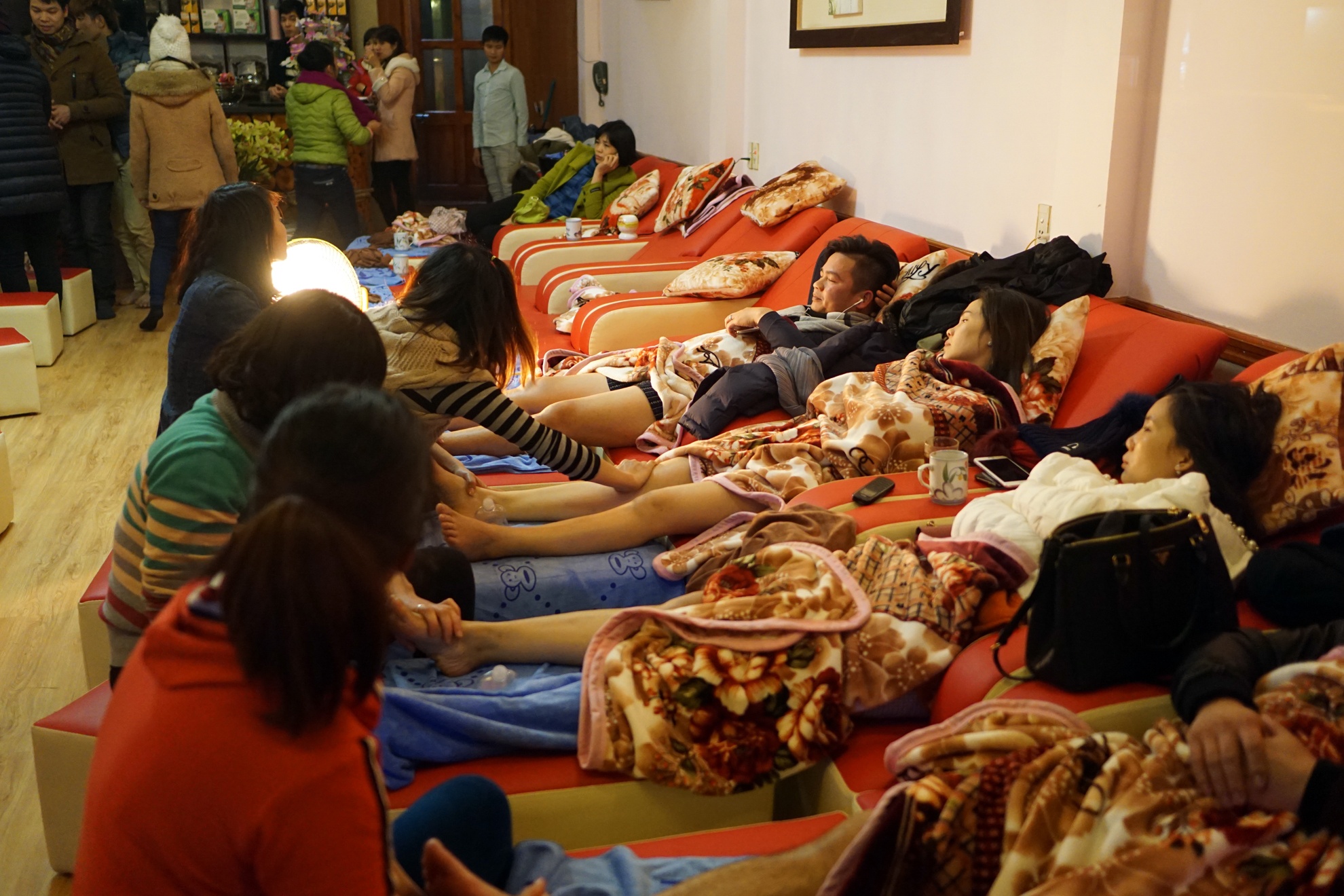 | Các cửa hàng massage ở thị trấn Sapa có chăn ấm, máy sưởi thu hút đông khách dịp này. |