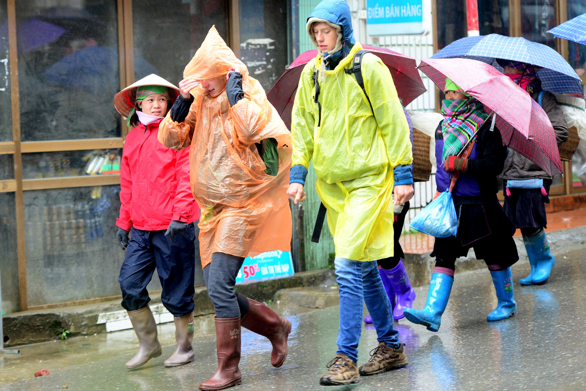 | Mặc dù thị trấn Sapa không mưa nhưng sương xuống dày kèm theo gió mạnh làm không khí thêm ẩm ướt, tấm nylon chắn gió chẳng mấy chốc bị sướt sũng. |