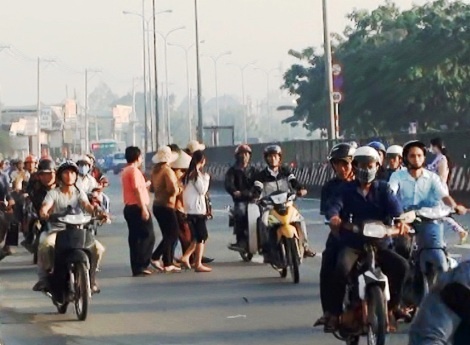 Cảnh tượng công nhân qua đường xảy ra trên quốc lộ 1, đoạn qua địa bàn giáp ranh xã Bà Điểm (huyện Hóc Môn) và phường Tân Thới Nhất (quận 12, TP.HCM).