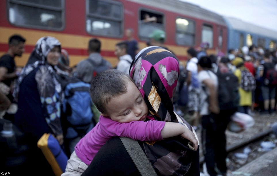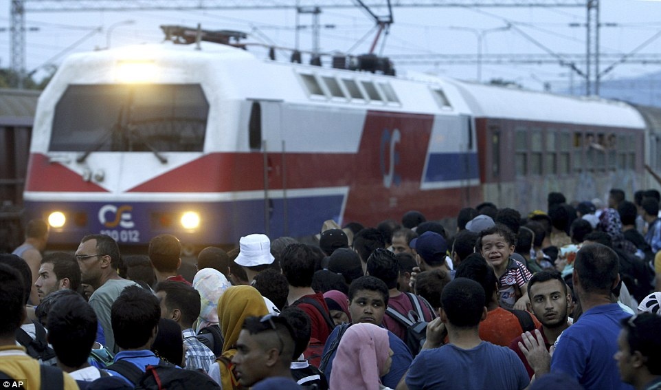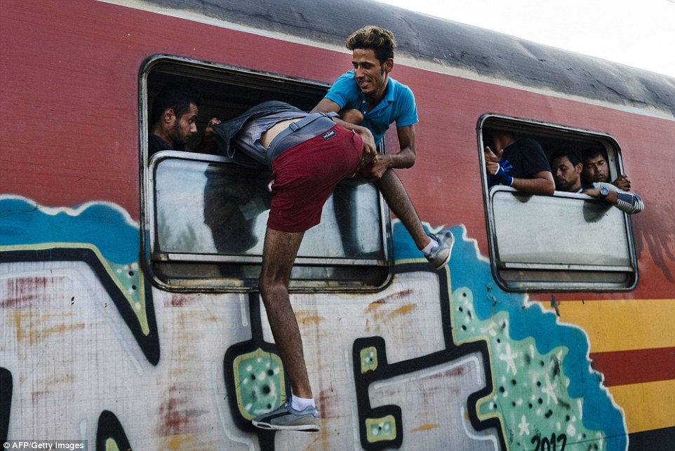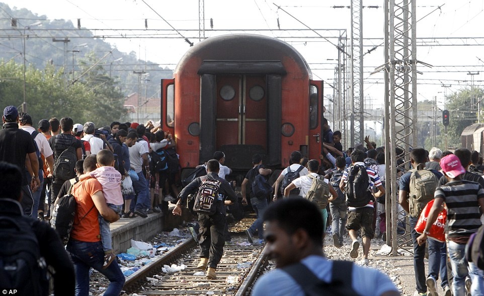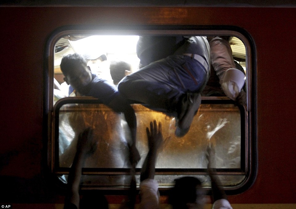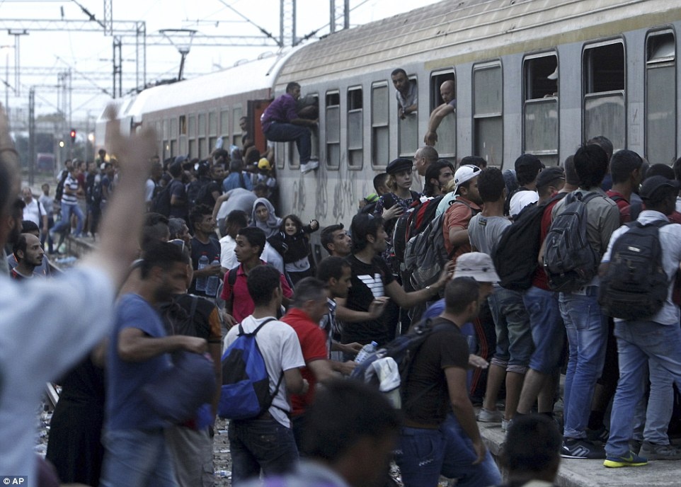 | Hàng nghìn người di cư chen lấn để lên những tàu sẽ đi qua Hy Lạp, Serbia, Hungary, Đức, Pháp và Anh. Ảnh: AP |